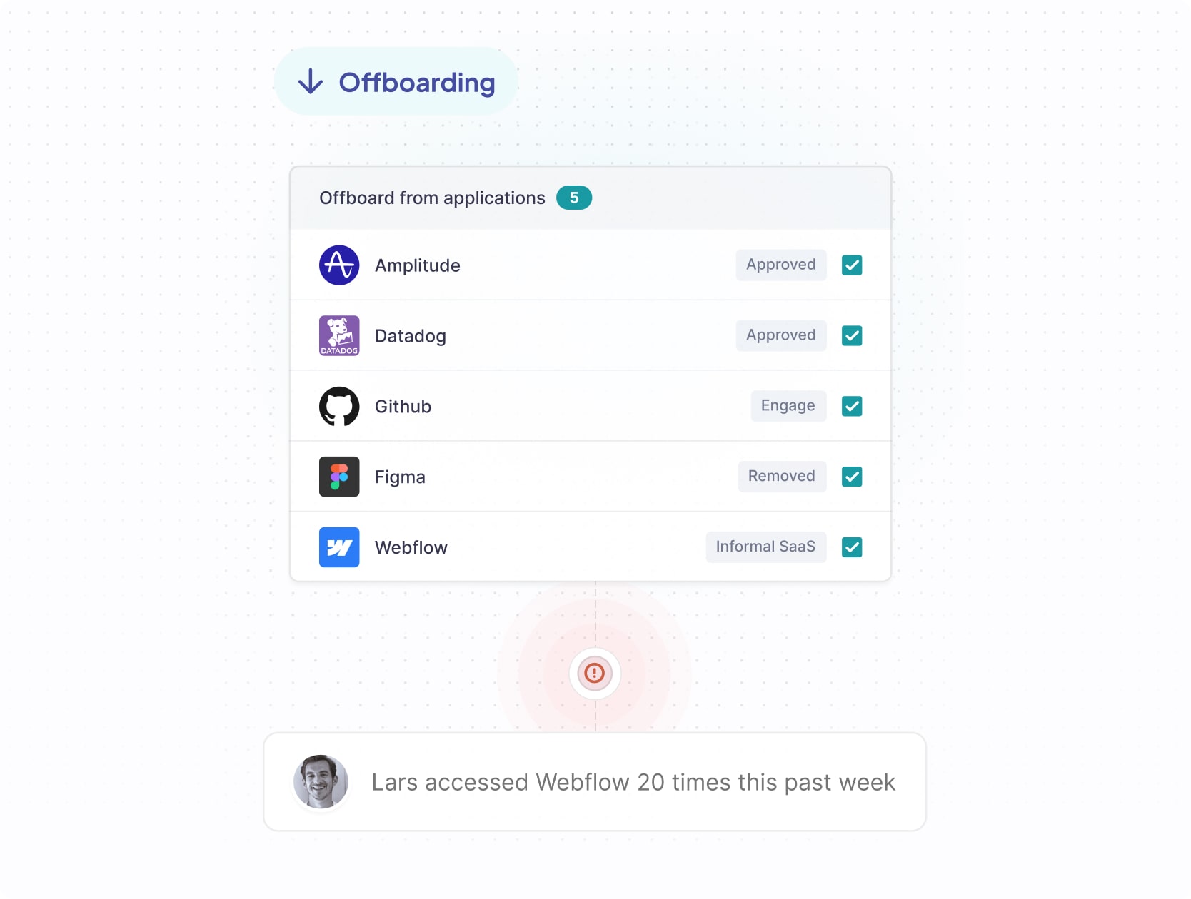 When a tool isn’t doing what you need, stop charges with a single click before renewal. If someone is moving on from the company, ensure they’ve been offboarded correctly with visibility of every tool.